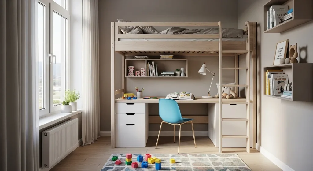 Placing the bed higher (loft or raised) allows the lower area to be used for study or play. This creates two functional levels within the same room. The layout feels spacious and efficient. It clearly separates rest from active zones. The design maximizes vertical space effectively. A high-impact small room solution.