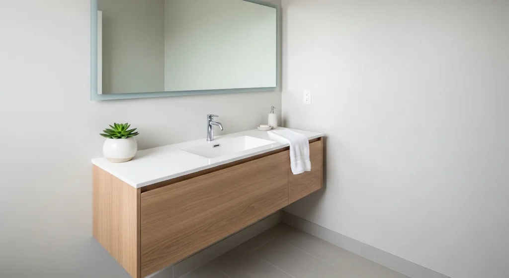 A floating vanity is one of the most effective minimal small apartment bathroom ideas for creating a clean and open look. Because the vanity is mounted on the wall, it leaves visible floor space underneath, making the bathroom feel larger. This design also helps maintain a minimalist aesthetic with simple lines and uncluttered surfaces. Neutral colored vanities work best for modern bathrooms. They pair beautifully with light tiles and subtle decor. Floating vanities also make cleaning the floor easier. Overall, they add both style and functionality to small bathrooms.