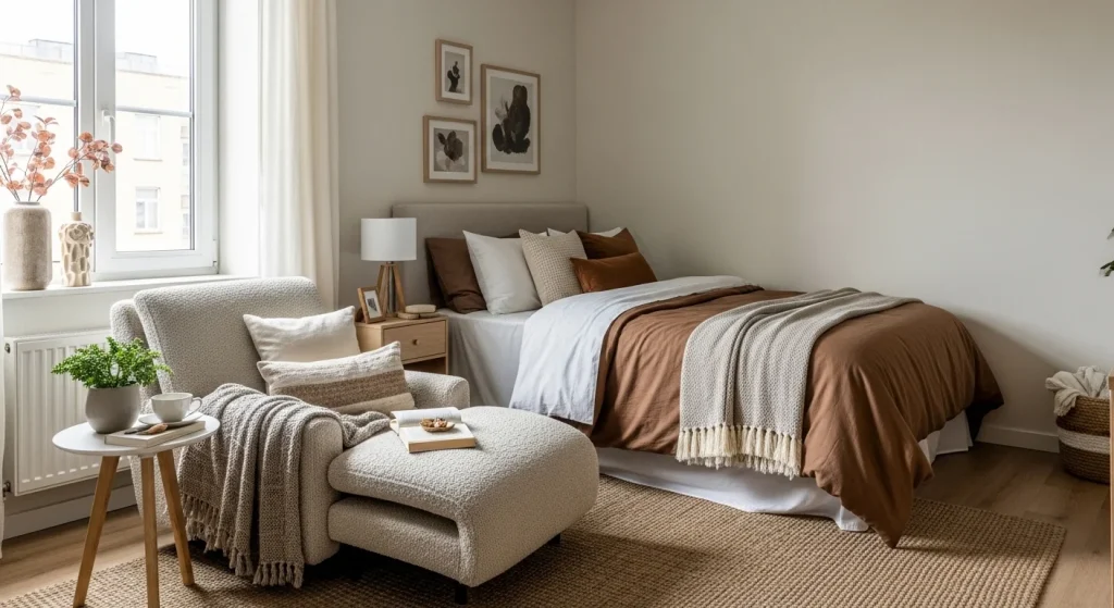 Adding a small chair or bench creates a separate relaxation zone. It distinguishes lounging from sleeping. The layout feels more functional and layered. It enhances comfort in the room. The space looks inviting. A simple but effective zoning idea.