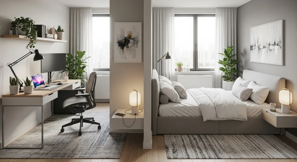 Using different paint tones or wall finishes can define separate areas visually. The sleeping zone can have softer tones, while the workspace uses slightly darker shades. This creates a clear distinction without physical barriers. The room feels cohesive yet divided. It enhances design depth. A subtle zoning technique.
