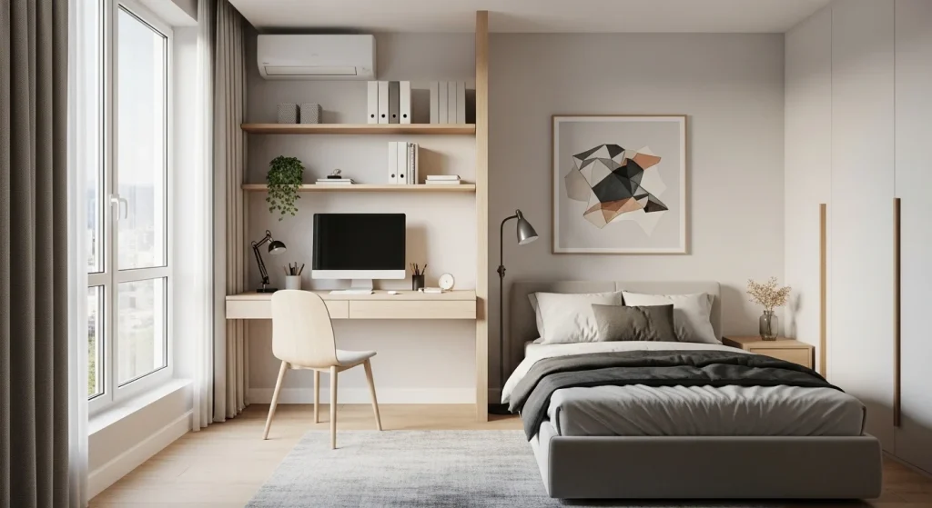 A floating desk creates a dedicated work area without taking up floor space. It visually separates the study zone from the sleeping area. The setup keeps the room open and uncluttered. It allows better movement across the space. The layout feels modern and efficient. A clean and minimal zoning approach.