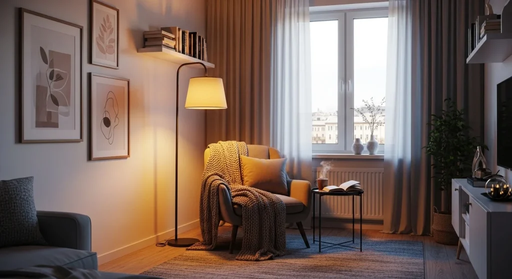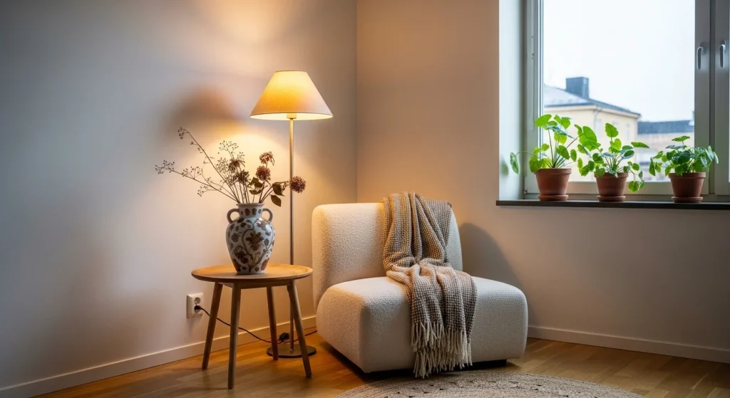 Adding a warm lamp in a corner creates a soft glow that instantly makes the space feel safe and comforting. It removes harsh shadows and adds depth to the room. The corner becomes visually warm and inviting. This lighting works especially well in the evening. It enhances relaxation. A simple but powerful comfort upgrade.