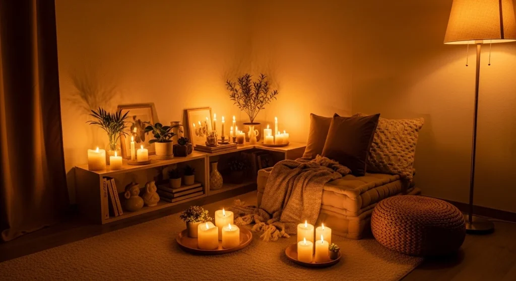 Adding candles to a corner introduces both soft light and a calming scent that enhances the comfort experience. The gentle glow creates a peaceful atmosphere. The scent adds an emotional layer to the space. The corner feels more immersive. It becomes a relaxing spot for unwinding. A sensory-focused cozy setup.
