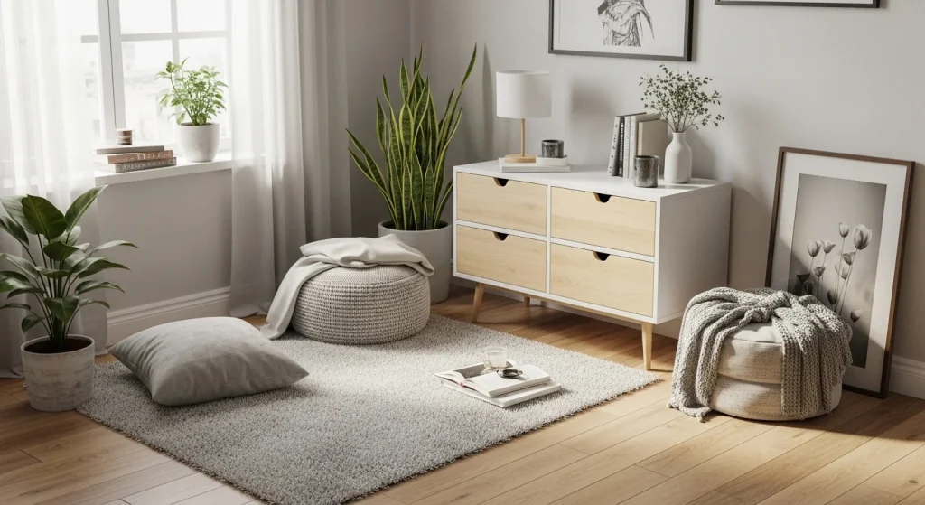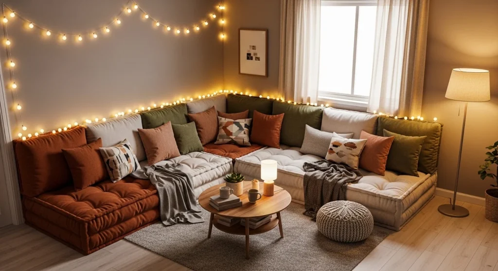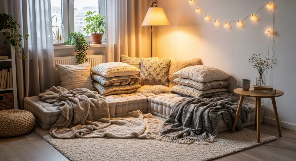 Using floor cushions in a corner creates a relaxed and grounded comfort space that feels casual and cozy. Layering cushions with a soft rug enhances warmth and softness. The low seating makes the space feel intimate. It encourages lounging and relaxation. The setup feels informal yet inviting. A perfect small-space comfort idea.