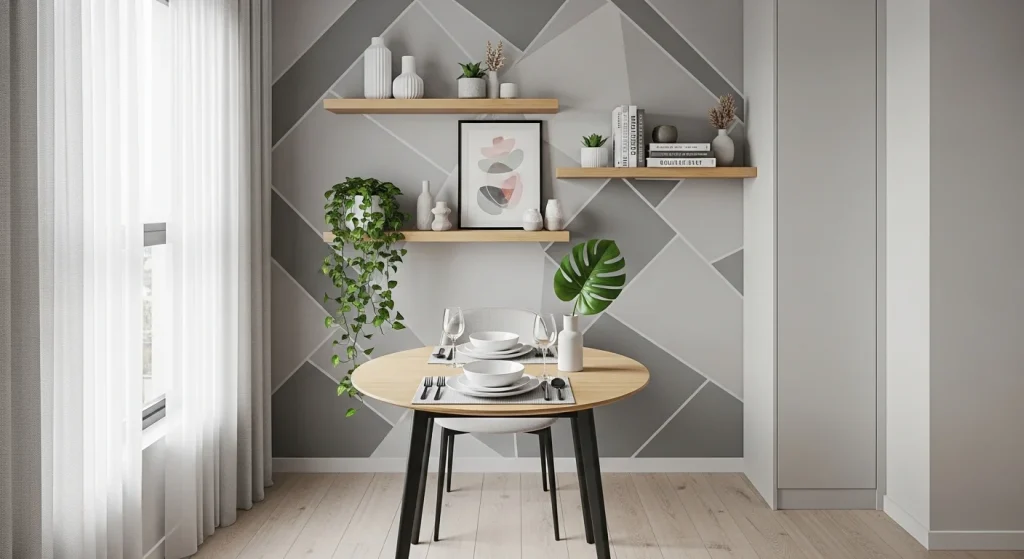 Adding floating shelves near your dining area provides extra storage without taking floor space. It keeps essentials within reach while maintaining a clean look. The setup feels organized and efficient. It also adds visual layering to the wall. The dining area looks more styled. A smart vertical storage idea.