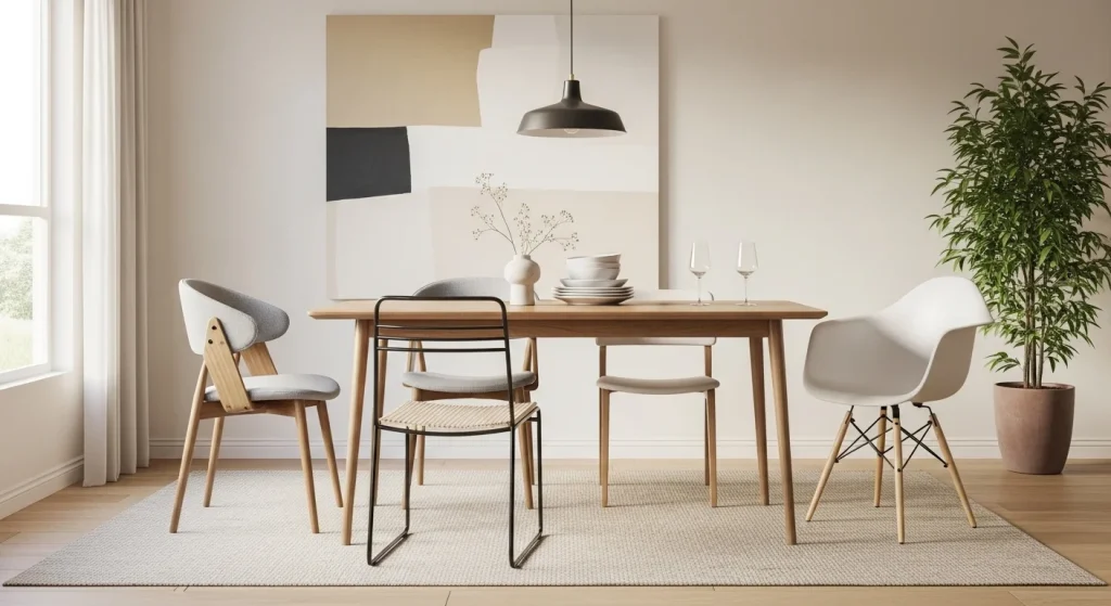 Mixing simple chair styles while keeping the palette consistent adds visual interest without clutter. It creates a relaxed and modern look. The setup feels curated rather than matched. It enhances personality in the space. The dining area becomes more dynamic. A subtle styling upgrade.