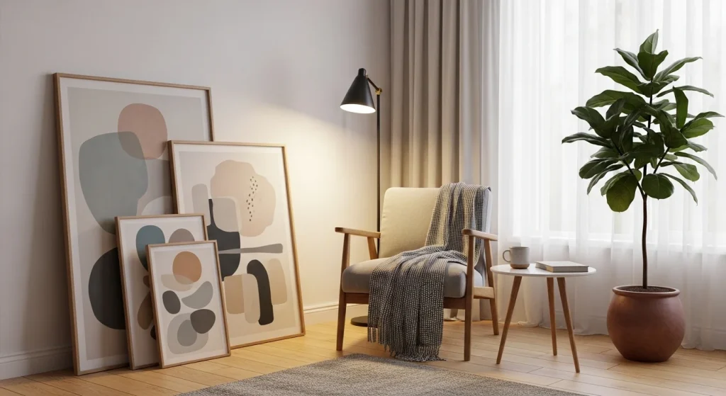 Leaning artwork against the wall creates a relaxed and modern look. It adds personality without needing installation. This makes it easy to update decor. It also keeps the corner stylish. It’s simple yet effective.