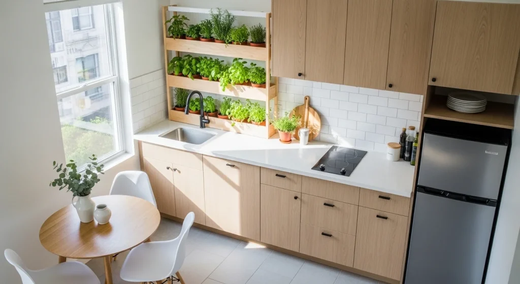 A small herb garden in the kitchen adds both function and freshness to your space. It keeps useful plants within reach. The setup feels lively and practical. It enhances daily routines. The greenery adds natural charm. A refreshing and useful idea.