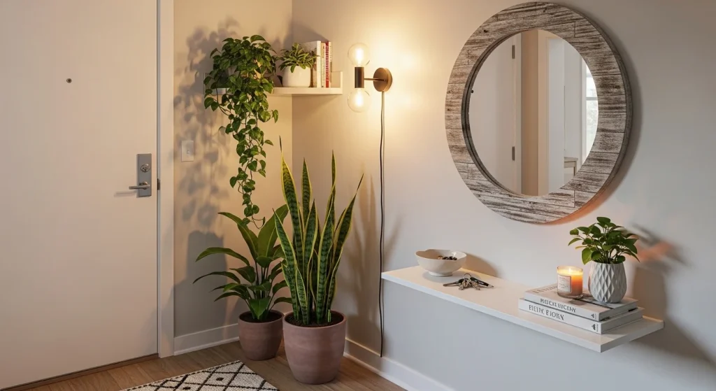 Placing plants in your entryway creates an instant refreshing first impression. It makes the space feel welcoming and alive. The setup feels warm and inviting. It sets the tone for the entire apartment. The greenery adds softness. A simple but impactful idea.