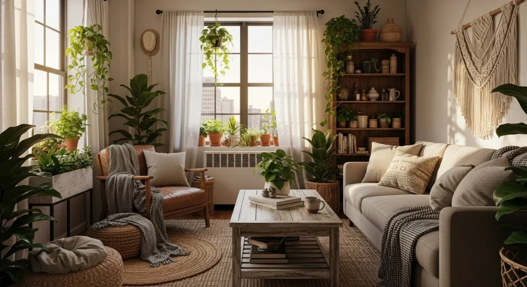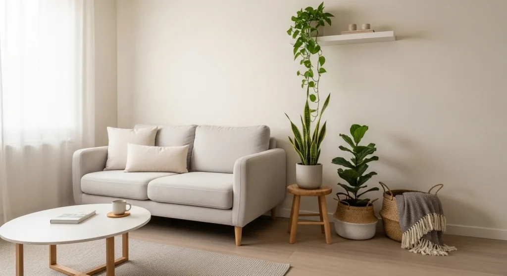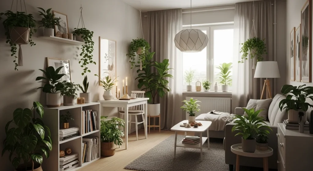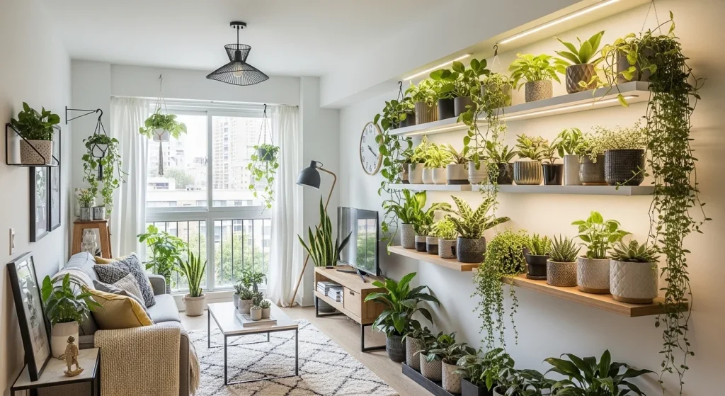 Using hanging plants adds greenery without taking up floor space. It creates a floating, airy effect in the room. The setup feels light and refreshing. It draws the eye upward. The space remains open and uncluttered. A great small-space solution.