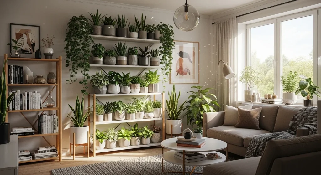 Using shelves to display plants keeps them organized while adding visual layering. It maximizes vertical space efficiently. The setup feels structured and clean. It creates a mini indoor garden wall. The room becomes more interesting without clutter. A smart design solution.