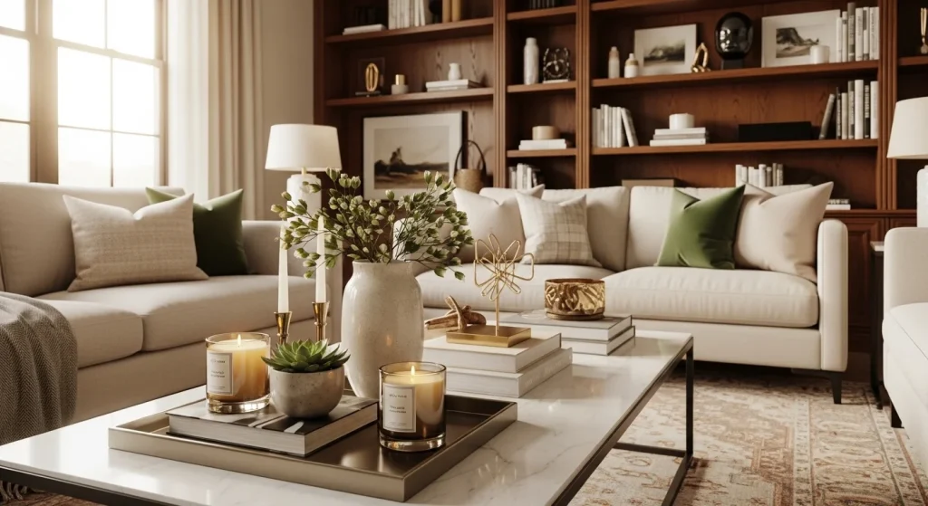 Using a tray to group decor items instantly makes surfaces look organized and intentional. It creates a styled moment rather than scattered objects. This small detail adds structure and elegance. The setup feels curated and refined. It works beautifully on coffee tables or bedside areas. A simple but effective luxury trick.