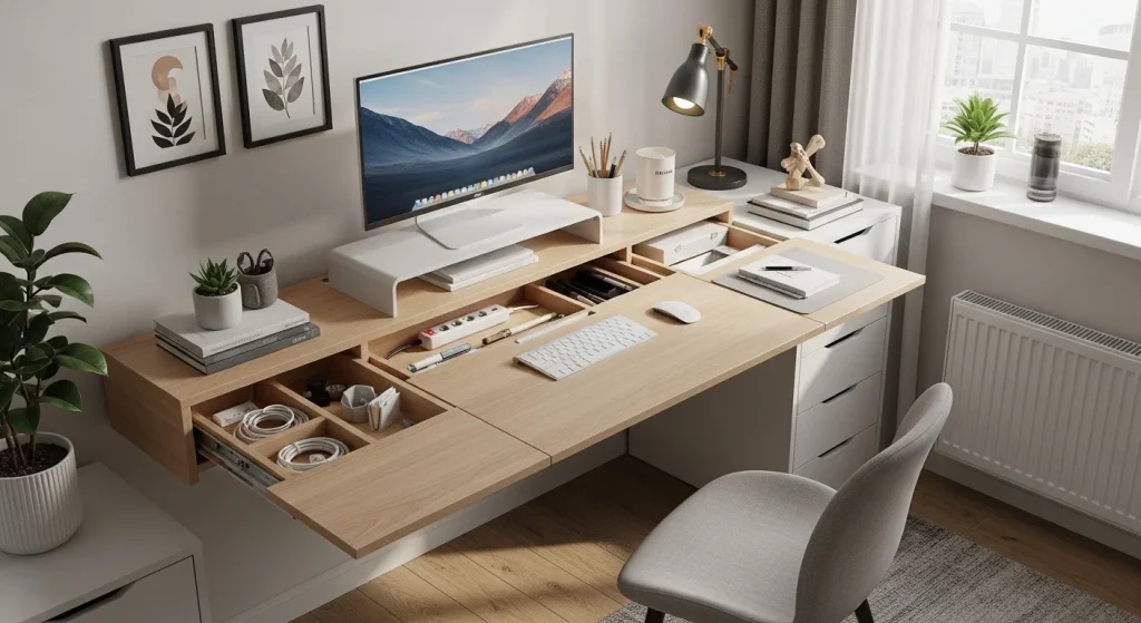 Incorporating hidden storage into your workspace keeps necessary items out of sight while still easily accessible when needed. This helps maintain a clean and organized surface without sacrificing functionality. The setup feels more polished and less cluttered throughout the day. It also reduces the time spent organizing repeatedly. A tidy environment makes it easier to concentrate and stay productive. This is a practical solution for everyday use.