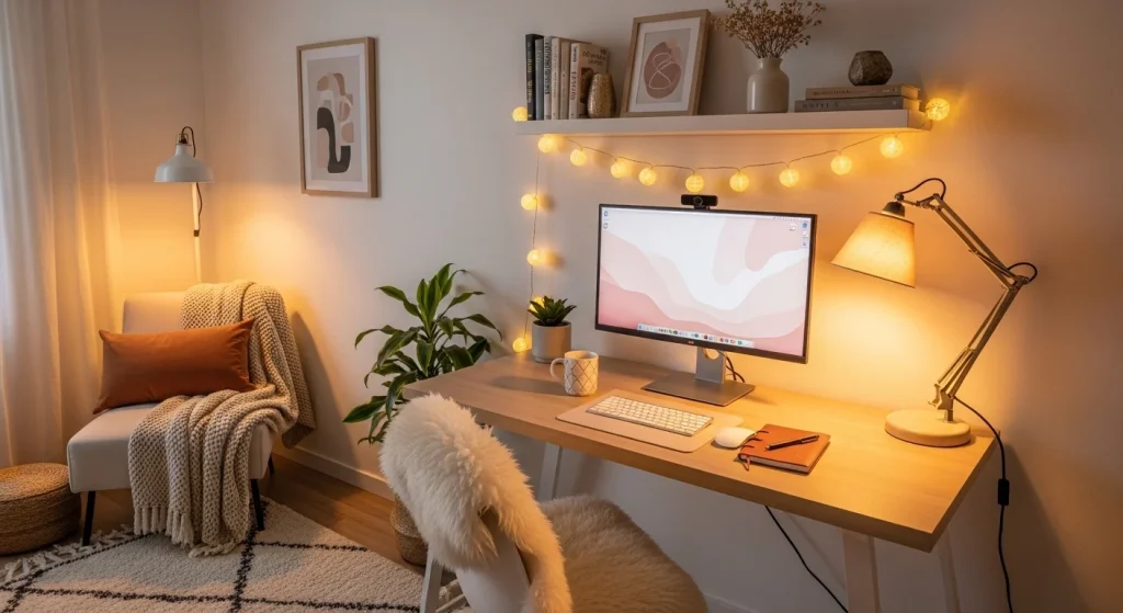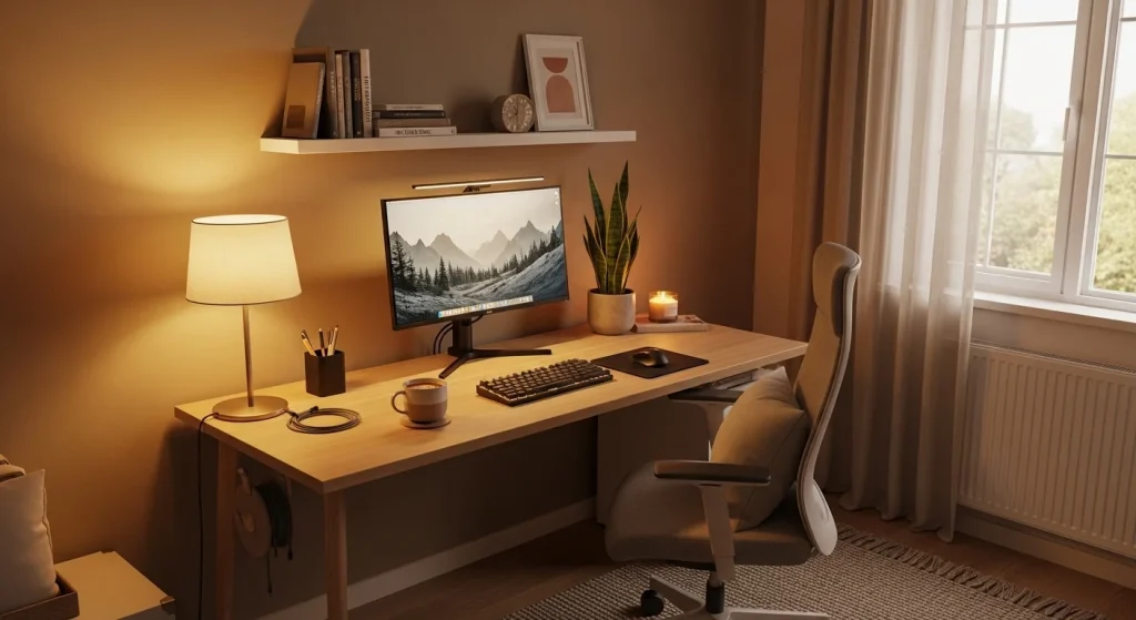 Harsh lighting can make you avoid using your workspace. Soft, warm lighting creates a more comfortable environment. The setup feels inviting and relaxed. It reduces eye strain. It makes working more enjoyable. A simple but effective improvement.